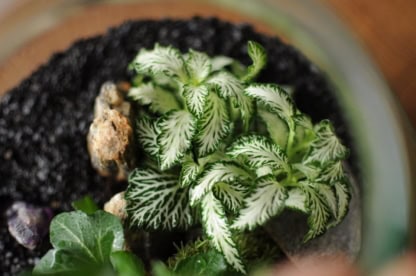 - Fitonia nie lubi suchego powietrza, do prawidłowego wzrostu potrzebuje wysokiej wilgotności powietrza, dlatego najpiękniej wygląda posadzona w szkle. Należy pamiętać, że chodzi tu o wilgotność powietrza (!), a nie podłoża, gdyż ten gatunek nie znosi zalewania korzeni wodą, podlewanie więc ograniczmy do minimum