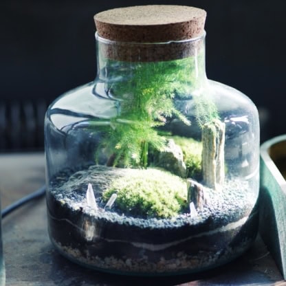 Szeroka szklana butla z naturalnym korkiem, wykonywana ręcznie w polskiej hucie. Jej oryginalny kształt pozwala na stworzenie w niej obszernej kompozycji z wilgociolubnych roślin, takich jak paprocie, fitonie oraz mchy. Butla jest stworzona ze szkła pochodzącego z recyklingu i posiada w swojej powierzchni niewielkie pęcherzyki powietrza, zaś samo szkło jest cienkie i mocno przepuszczalne dla promieni słonecznych. Idealna na prezent, do samodzielnego stworzenia w niej lasu w szkle.