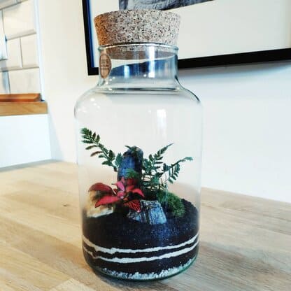 Szklana butla wykonana ręcznie ze szkła pochodzącego z recyklingu w polskiej hucie. Charakteryzuje się smukłym pokrojem, delikatnymi pęcherzykami powietrza w powierzchni szkła oraz dużą przepuszczalnością dla promieni słonecznych. Dodatkowo zielonkawe zabarwienie szkła dodaje mu charakteru i pozwala na stworzenie w środku średniej wielkości kompozycji z roślin leśnych, a także tropikalnych. Świetnie pomieści niewielkie rośliny o zdrewniałych pędach, np. krotony. Dzięki szczelnemu korkowemu zamknięciu świetnie sprawdzi się dla wszystkich zamkniętych, wilgotnych kompozycji roślinnych.