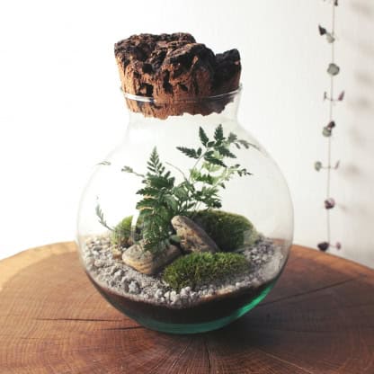 Szklana wykonana ręcznie ze szkła ekologicznego (pochodzącego z recyklingu) w polskiej hucie. Zestaw składa się ze szklanej kuli o wys. 20 cm wykonanej ze szła, które posiada dużą przepuszczalność dla promieni słonecznych. W skład zestawu wchodzi także wykonywany przez nas ręcznie korek z kory drzewa korkowego o niepowtarzalnym charakterze i w limitowanych ilościach. Kula idealna do tworzenia małych mszanych ogródków (mossarium), a także lasów w szkle czy lasów tropikalnych. W środku możesz posadzić paprocie np. wietlicę, bluszcze, a także fitonie.