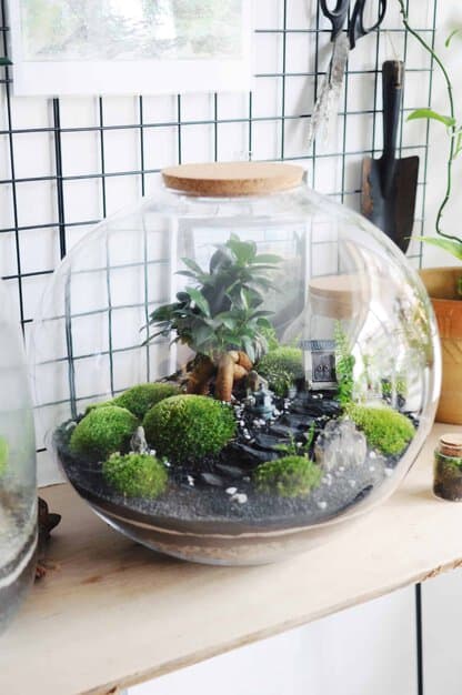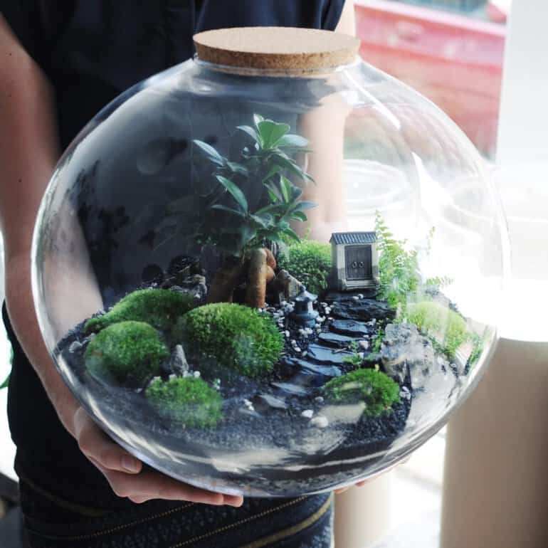 Ta szklana kula w rozmiarze XXL to 35 centymetrów możliwości! Wykonana z grubego, białego szkła pomieści tropikalną dżunglę stworzoną z ciepłolubnych gatunków jak i kompozycję w stylu japońskim. Ogród pionowy i poziomy. Pobudź swoją kreatywność lub wykorzystaj nasz pomysł na kompozycję wewnątrz tego szklanego słoja i stwórz w nim własny las w szkle. Zamknięty ekosystem roślinny nie wymaga podlewania oraz nawożenia, ponieważ w środku woda krąży w obiegu zamkniętym, a także odbywa się proces obiegu materii. Skusisz się na tego giganta? Jeżeli tak to pochwal się efektami swojej pracy!