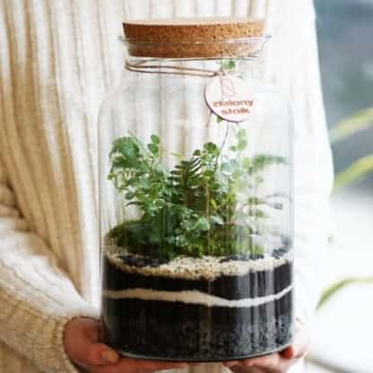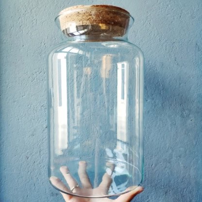 30-to centrymetrowy szerkoki słój z naturalnym korkiem, wykonany ręcznie w polskiej hucie. Jego oryginalny kształt pozwala na stworzenie w niej obszernej kompozycji z wilgociolubnych roślin, takich jak paprocie, fitonie oraz mchy. Słój został stworzony ze szkła pochodzącego z recyklingu i posiada w swojej powierzchni niewielkie pęcherzyki powietrza, zaś samo szkło jest cienkie i mocno przepuszczalne dla promieni słonecznych. Idealny do posadzenia lasu w słoiku.