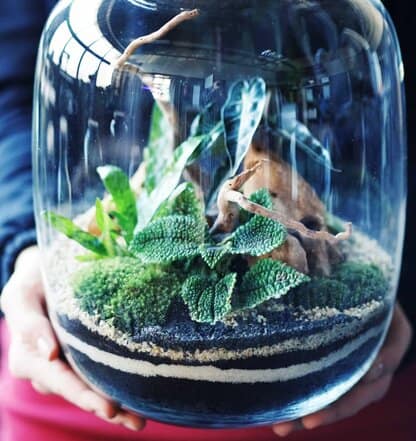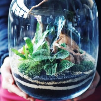 Ogrody w szkle – miniaturowe ekosystemy, mchy i paprocie zamknięte w szklanych słojach, odwzorowujące w skali lasy tropikalne lub wilgotne i ciemne runo leśne. To małe biosfery, gdzie panujące warunki imitują naturalne środowisko życia roślin. Otoczone szkłem stanowią małe dzieła sztuki, a raz zamknięte nie wymagają ponownego otwierania i pielęgnacji.
