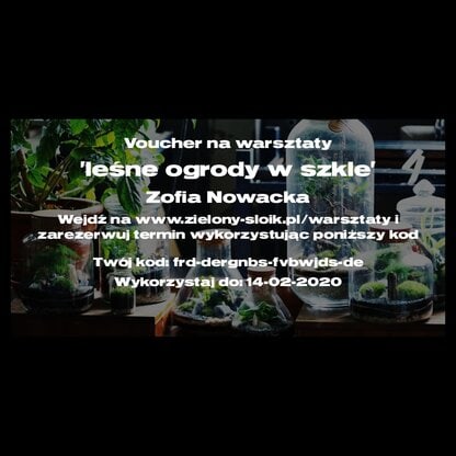 Wejściówka dla jednej osoby, która upoważnia do wejścia na warsztaty online ‘Leśne Ogrody w szkle’ organizowane przez Zielony Słoik z Wrocławia. Wejściówka jest ważna przez 6 miesięcy od daty wystawienia przez organizatora.