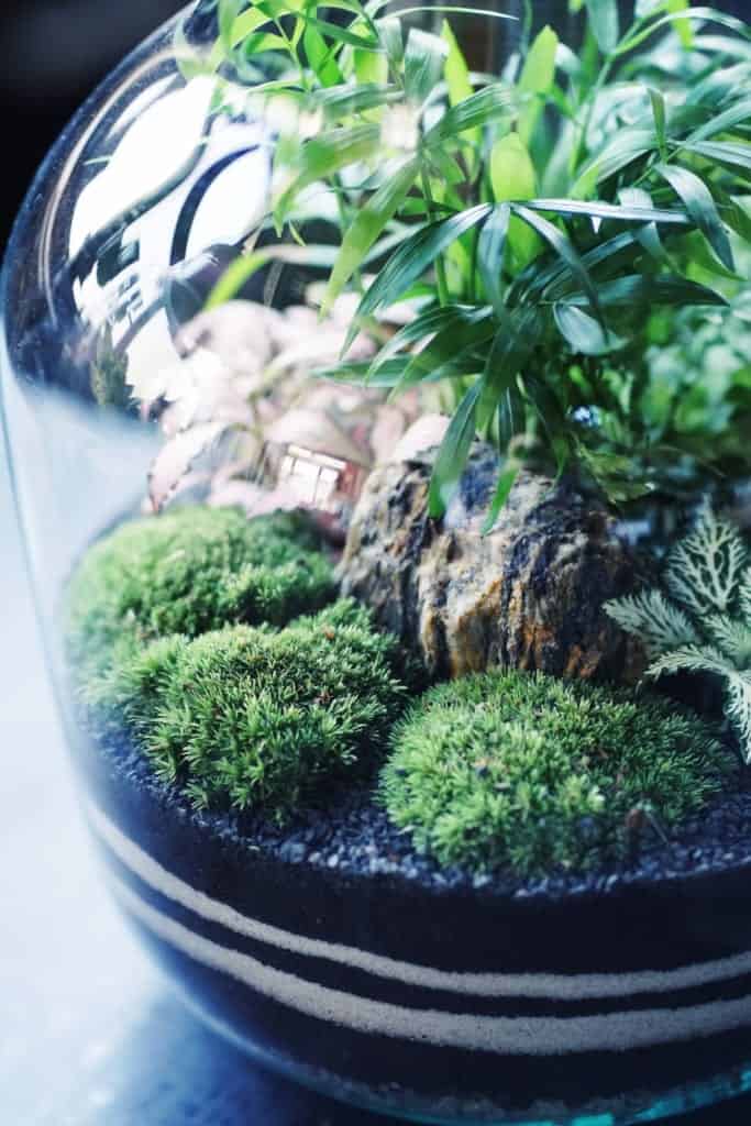 - starannie dobrane przez nas rośliny potrzebne do stworzenia kompozycji – palmę koralową, dwie barwne odmiany fitonii oraz paproć wietlicę. Gatunki roślin dobieramy tak, aby rośliny były najbardziej odporne, długowieczne a także łatwe w utrzymaniu w zamkniętym ogrodzie w szkle. Rośliny mamy dobrze sprawdzone w warunkach “słoikowych”