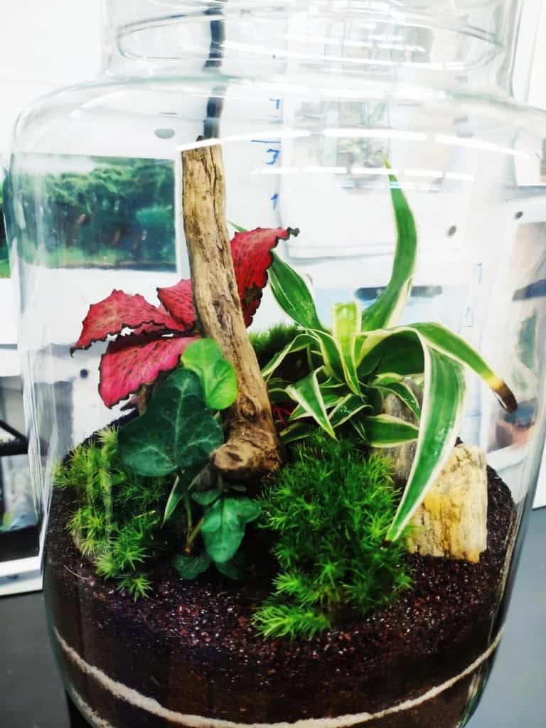 Tutaj wspomnę jeszcze o jednej istotnej kwestii. Las w szkle został zamknięta szklaną pokrywą, która ma zarówno swoich zwolenników jak i wielu przeciwników. Wielu osobom szklane pokrywki kojarzą się trochę “babciowo”, bardziej klasycznie lub po prostu mało nowocześnie. Jednak takie szklane zamknięcie słoika ma swoje niepodważalne zalety. Dzięki szklanej pokrywce do takiego lasu w słoiku dociera zdecydowanie więcej światła. Kompozycja jest lepiej oświetlona więc rośliny czują się lepiej, rosną do góry zamiast ku ścianom słoika i kompozycja po prostu wygląda lepiej. Oczywiście to rozwiązanie ma też swoje gorsze strony, ale o nich w kolejnym artykule (znajdziesz go TU).