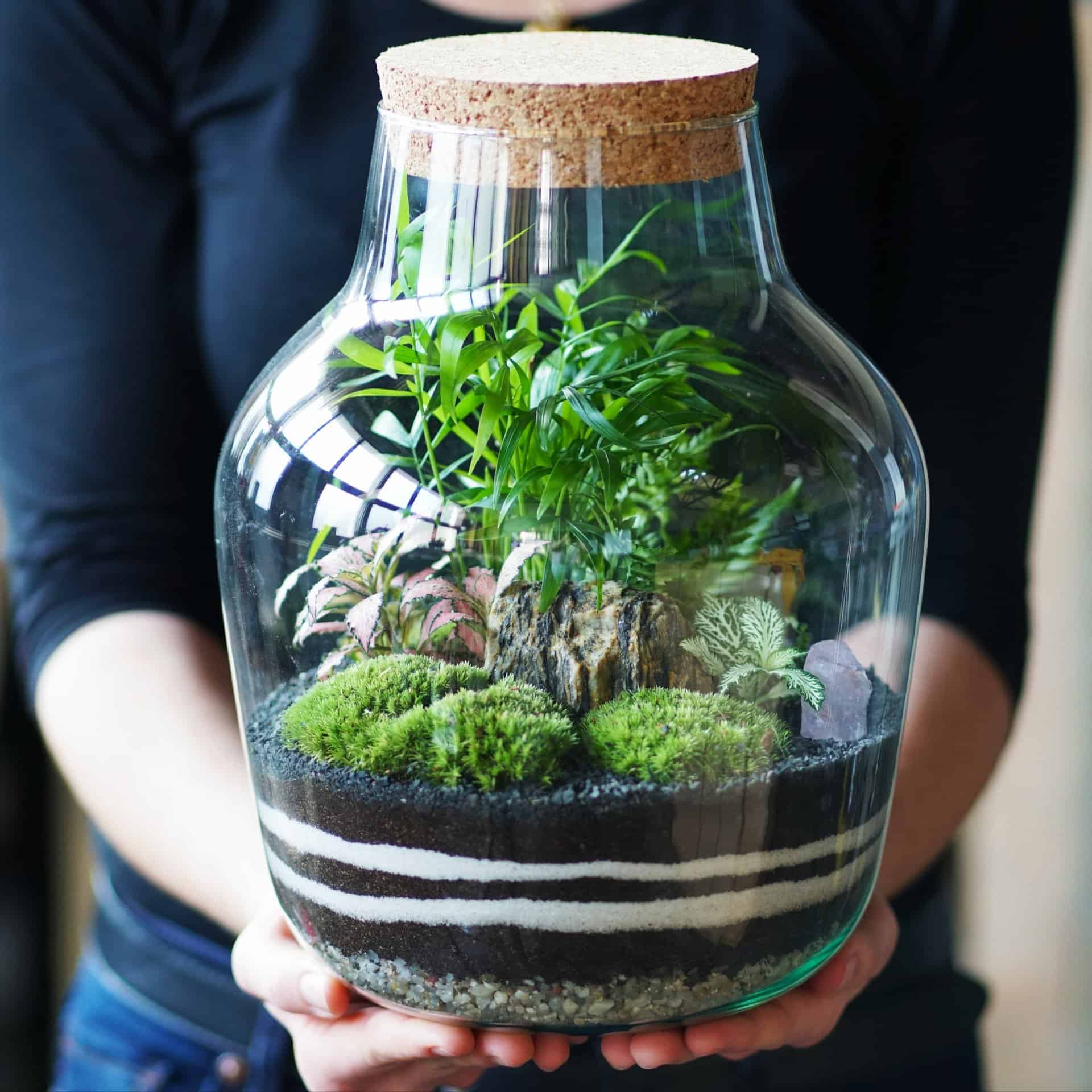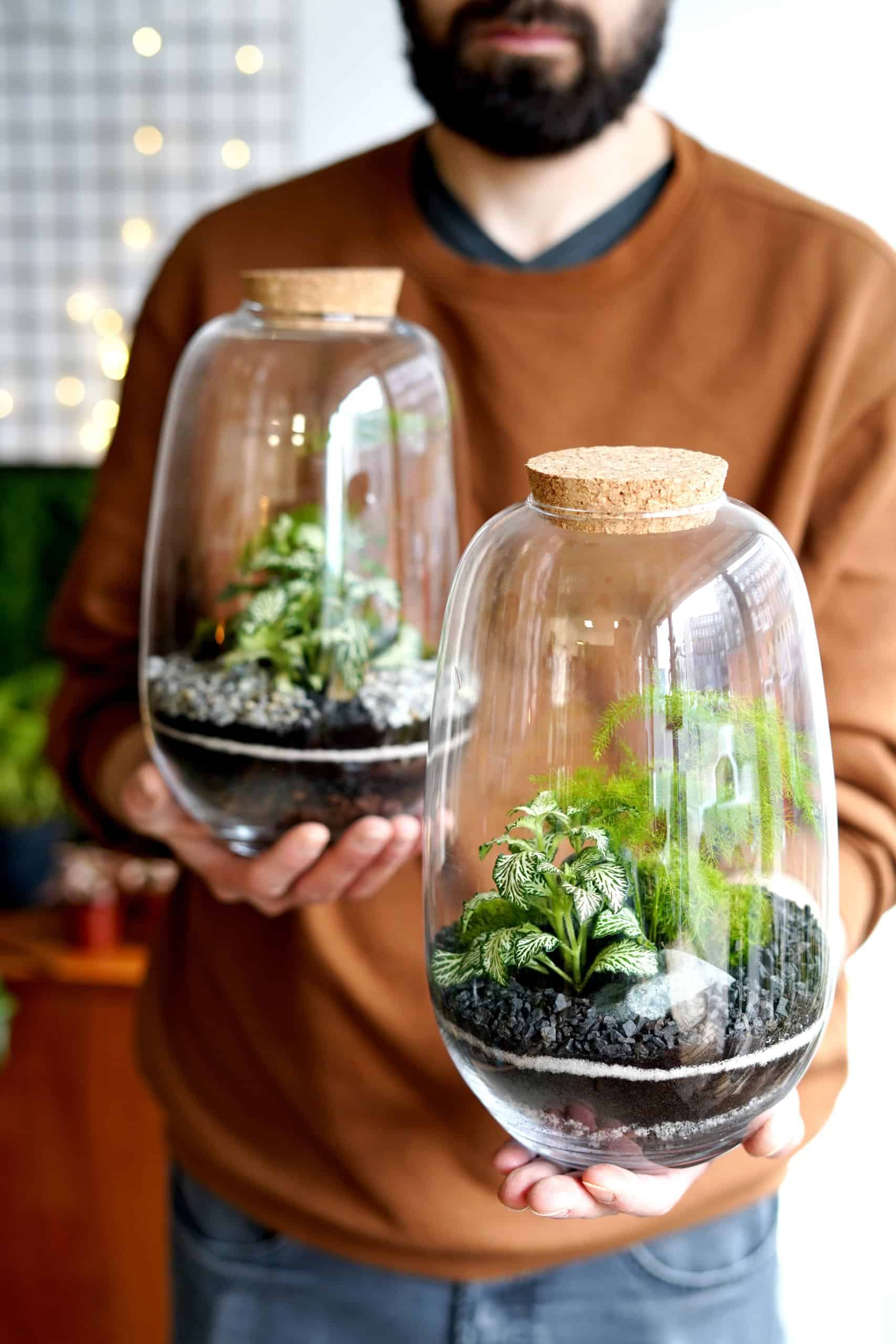 • Wszelkie materiały do stworzenia ogrodu w szklanym słoju o wybranej wysokości (rośliny, podłoża, żwiry, mchy, narzędzia, dekoracje, torby)